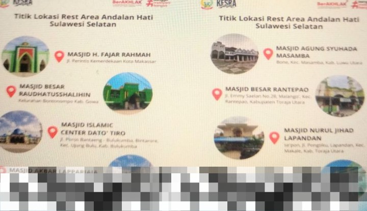 Bagi masyarakat yang berencana menuju wilayah Luwu Raya, Masjid Agung Syuhada Masamba yang terletak di Kabupaten Luwu Utara juga akan menjadi pilihan area istirahat yang nyaman. Dengan semakin banyaknya titik istirahat yang disediakan, diharapkan pemudik dapat merasa lebih aman dan nyaman selama perjalanan mereka.